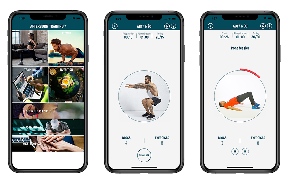 L’application AfterBurn Training ® contient un timer pour réaliser les séances, une section « Mouvements » pour apprendre les techniques et prévenir des blessures, et une section « Nutrition » qui contient des conseils, des recettes et même votre liste de course pour avoir un corps sec et dessiné.