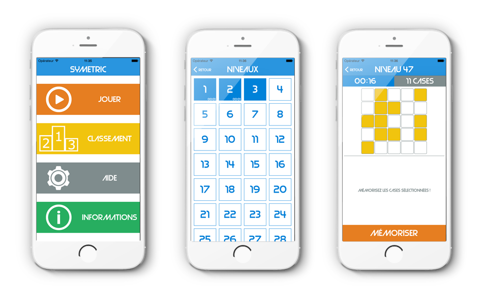 L'application Symetric est une idée originale 123 Mobile. Elle se base sur la mémorisation et la symétrie verticale. Le joueur doit mémoriser et reproduire le plus rapidement possible l'exemple donné tout en lui appliquant une symétrie verticale. La complexité dépend du temps de mémorisation et du nombre de cases sélectionnées.
